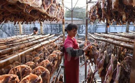 在田心村的晴阳腊味加工场,记者看到,十多名工人正忙碌地晾晒腌制好的腊鸭,泛着油光的腊鸭散发出淡淡诱人的香味。该加工场老板林健光介绍,腊鸭的质量、风味主要取决于鸭子的质量,腌制好后再经天然生晒而成,这样制作出的腊鸭肉质、风味独特。今年,腊味的价格与去年基本持平,其中腊鸭10元/斤或20多元/斤,腊肉、腊肠等30元/斤。