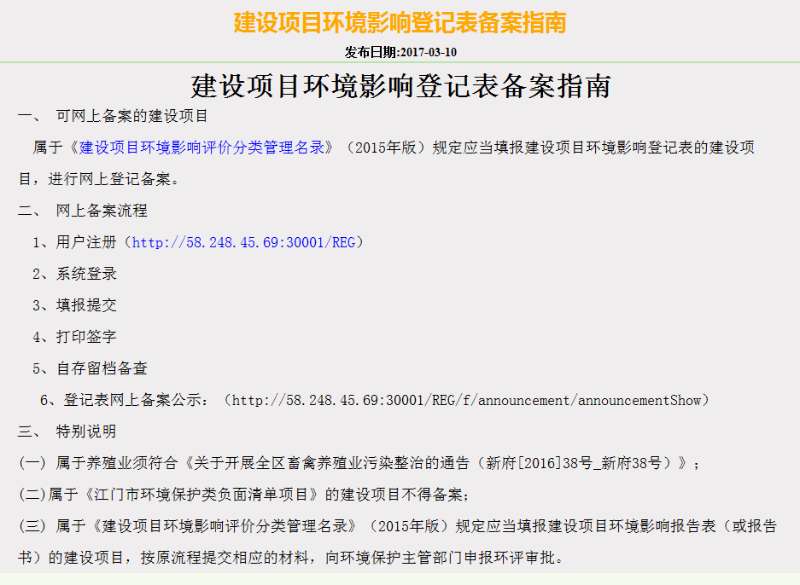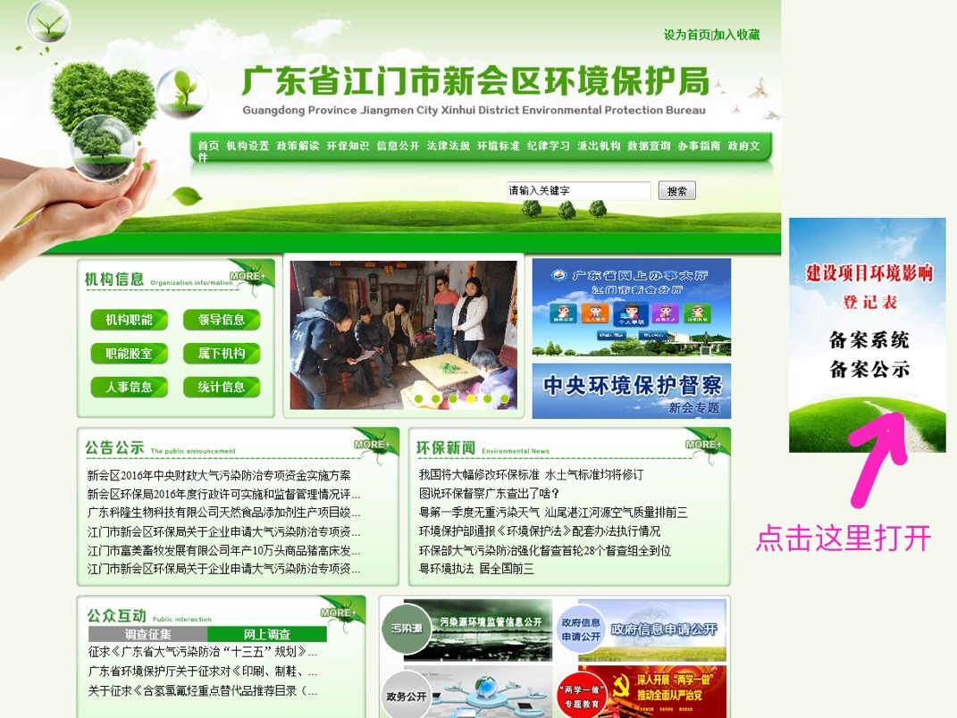 建设项目环境影响登记表可以通过备案系统自行办理,网站索取方法:1、可以通过新会区环境保护局的官方网站在页面上点击链接打开;2、可以到新会区行政服务中心三楼环保窗口或镇建环局索取网址。
