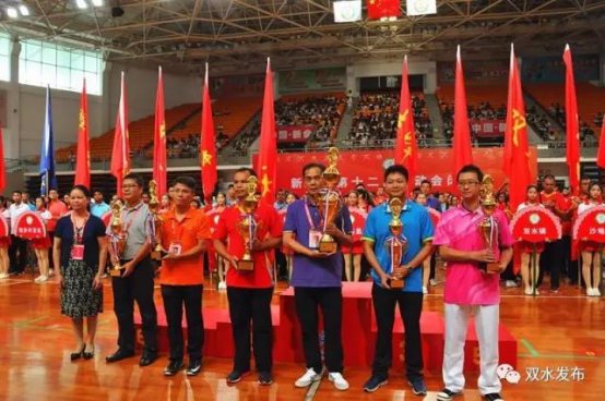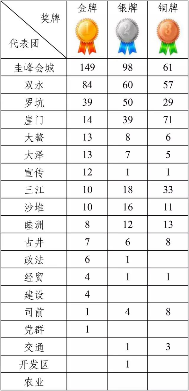 我镇参赛运动员奋力拼搏,以金牌总数84枚,银牌总数60枚,铜牌总数57枚,列位奖牌榜第二。其中,在田径比赛项目中,双水代表团累计总分排名第一,远超第二名近300分,并获得“体育道德风尚奖”。
