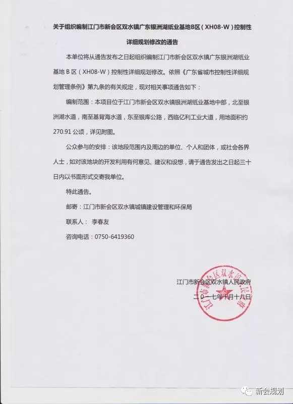 新会规划局将从通告发布之日起组织编制江门市新会区双水镇广东银洲湖纸业基地B区(XHO8-W)控制性详细规划修改。依照《广东省城市控控性详细规划管理条例》策九条的有关规定,现对相关事项通告如下: